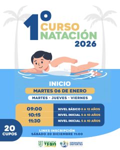 Durante el presente año se están desarrollando los Cursos de Natación Infantil 2026, dirigidos a niños y niñas entre 5 y 12 años, los cuales se realizan en la Piscina Municipal,