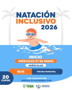 El día de hoy, miércoles 07 de enero, se dio inicio al Taller de Natación Inclusiva Infantil en la Piscina Municipal, una iniciativa gratuita, dirigida a niños y niñas, y que se desarrolla con inscripción previa.
