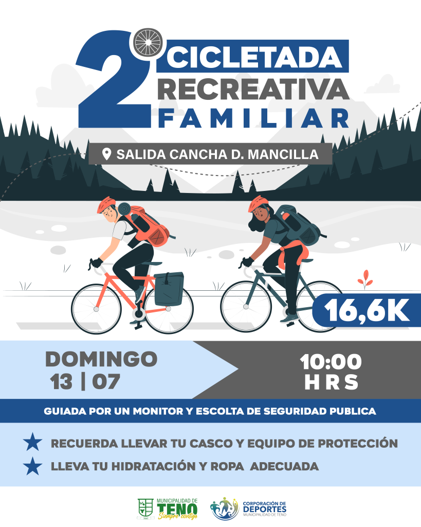 2° Cicletada Recreativa Familiar 🚴🏼♂️🌿 El pasado domingo 13 de julio, se llevó a cabo con gran éxito la 2da Cicletada Recreativa Familiar organizada por la Corporación de Deportes de Teno. La jornada comenzó en el sector de La Mancilla y finalizó en Ventana del Bajo, recorriendo en bicicleta uno de los […]